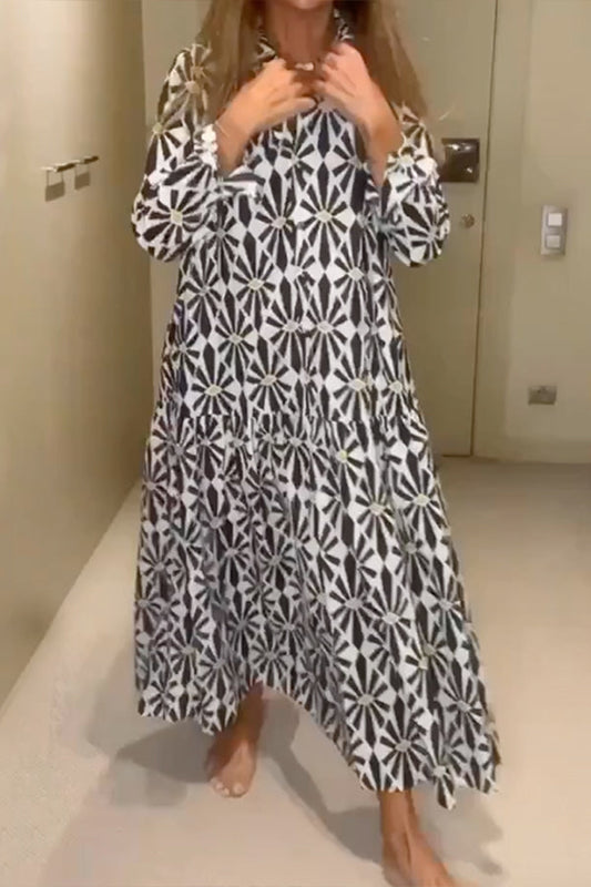 Printing Long Sleeves Loose V-Neck Maxi Dresses