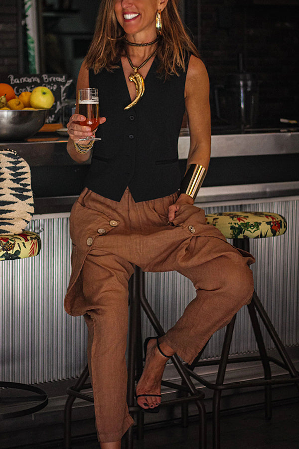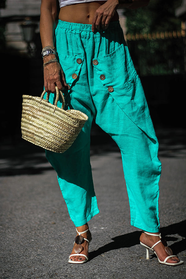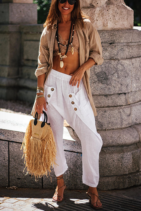 BRENNA LINEN BLEND POCKETED BUTTON DETAIL ELASTIC WAIST HIPPIE PANTS