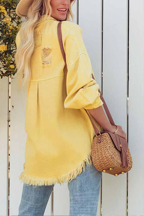 Distressed Raw Hem Denim Jacket with Chest Pockets