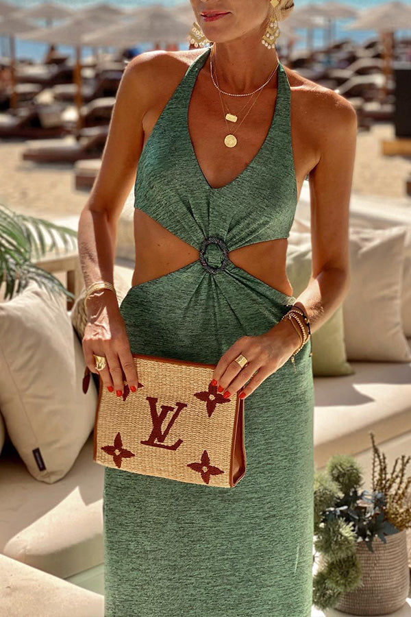 Island Covenant Ring Decorated Double Sides Open Waist Belted Resort Long Dress